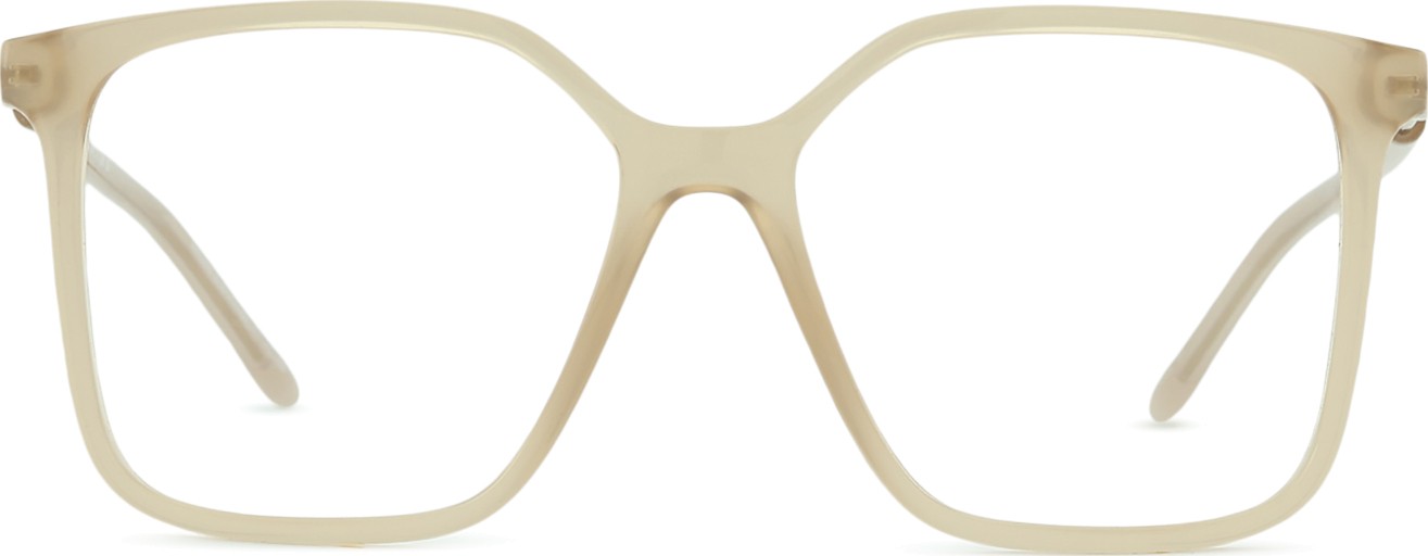 A cor bege da armação combina perfeitamente com um tom de pele escuro e um cabelo castanho claro.