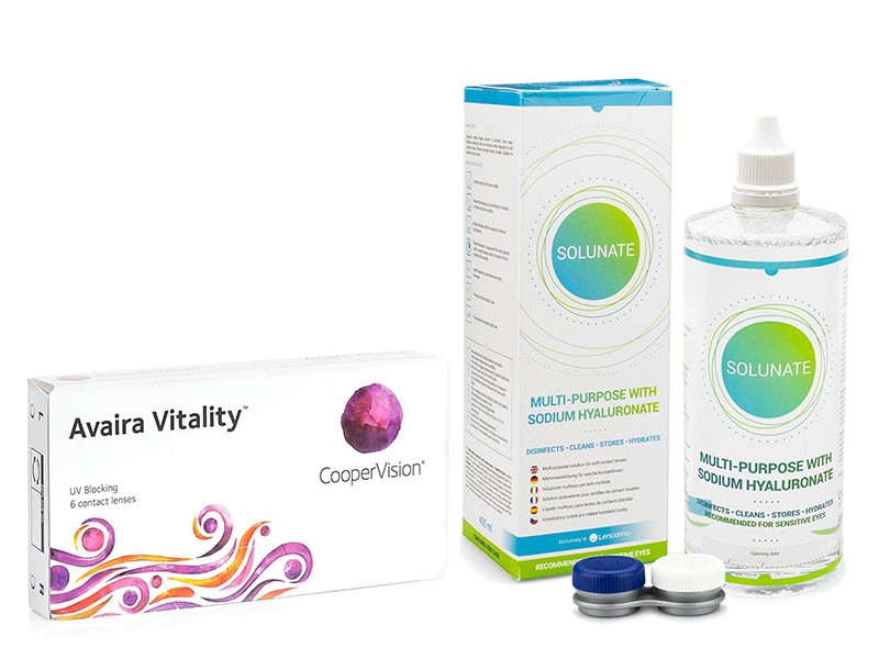 Oferecemos um pack de poupança com as lentes de contacto mensais Avaira Vitality (6 lentes) e o líquido Solunate Multi-Purpose 400 ml.