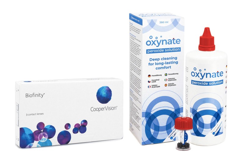 Oferecemos um pacote económico de lentes Biofinity com solução de peróxido Oxynate de 380 ml.