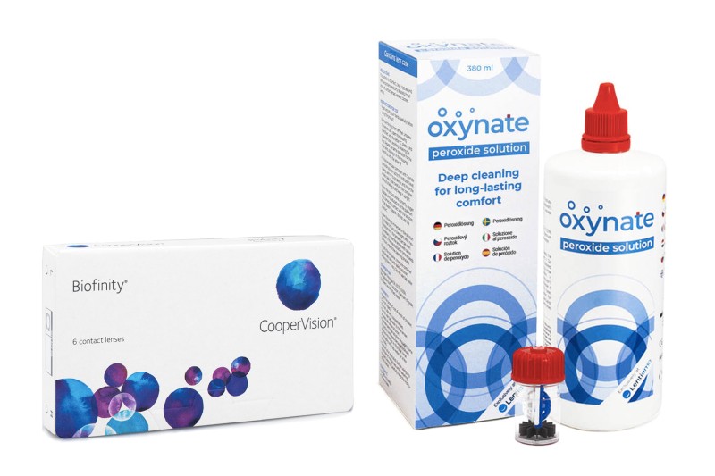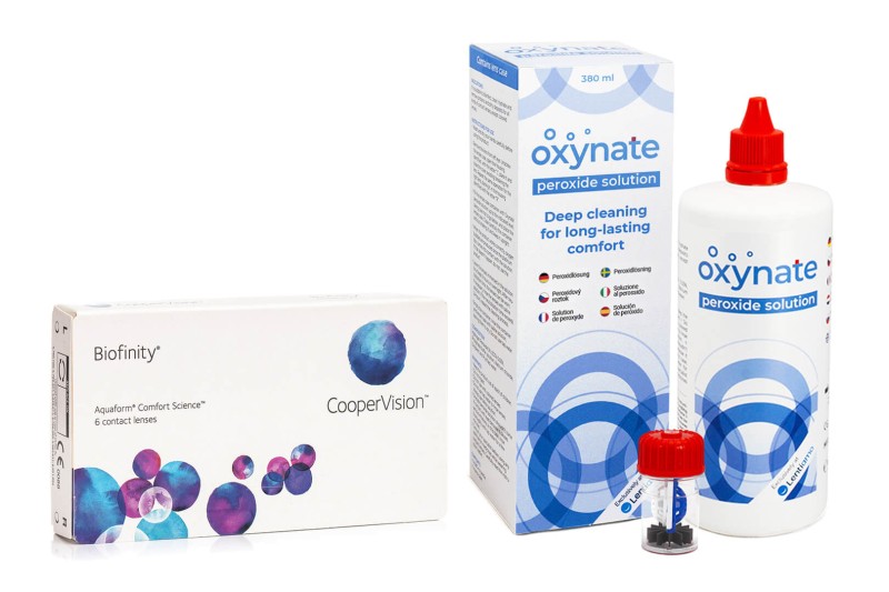 Oferecemos um pacote económico de lentes Biofinity com solução Oxynate de Peróxido de 380 ml.
