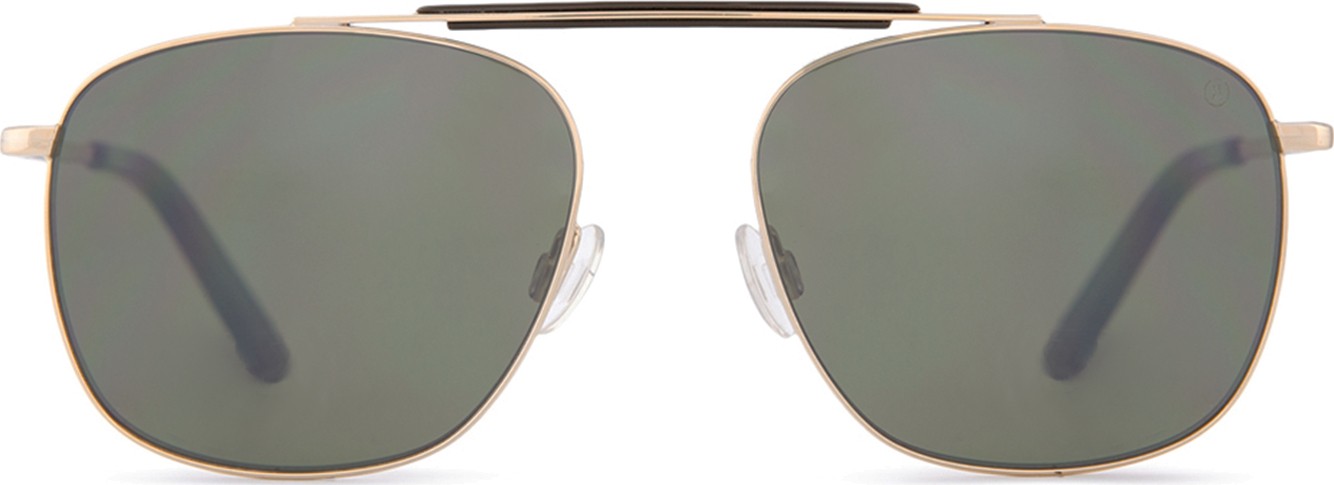 - A cor dourada da armação combina perfeitamente com um tom de pele quente e um cabelo castanho escuro.