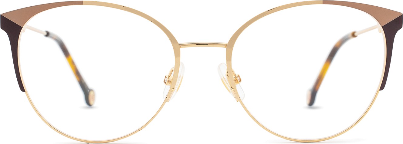 - A cor dourada da armação combina perfeitamente com um tom de pele escuro e um cabelo castanho escuro.