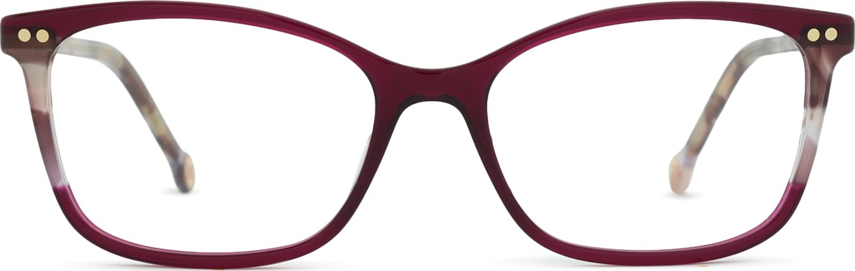 - A cor púrpura da armação combina perfeitamente com um tom de pele claro e um cabelo preto, cinzento, branco ou loiro claro.