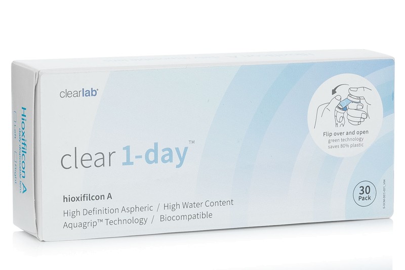 Clear 1-day (30 Lentes) da ClearLab são lentes de contacto diárias com um design asférico ideal para situações que requerem um maior esforço da visão, como conduzir à noite ou trabalhar com o computador, corrigindo também o astigmatismo leve. As lentes de contacto são feitas de um material biocompatível e flexível que mantém a água na lente. Com a sua inovadora tecnologia, as lentes da ClearLab não são apenas as mais higiénicas do mundo, mas as mais respeitadoras do meio ambiente (contêm 80% menos plástico e 70% mais água). As lentes de contacto Clear 1-day estão disponíveis nos seguintes parâmetros: de –10.0 a – 6.0 com passos de 0.5 e de –6.0 a +6.0 com passos de 0.25.