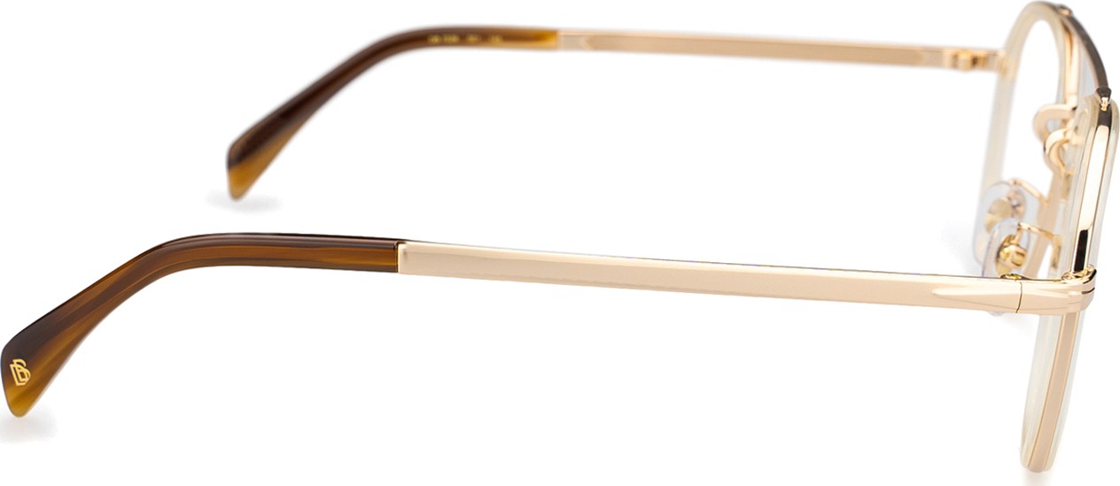 - A cor dourada da armação combina perfeitamente com um tom de pele escuro e um cabelo castanho escuro.