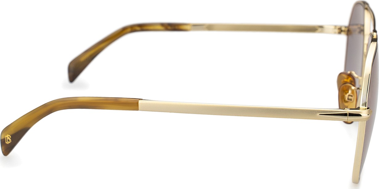 - A cor dourada da armação combina perfeitamente com um tom de pele quente e um cabelo castanho escuro.