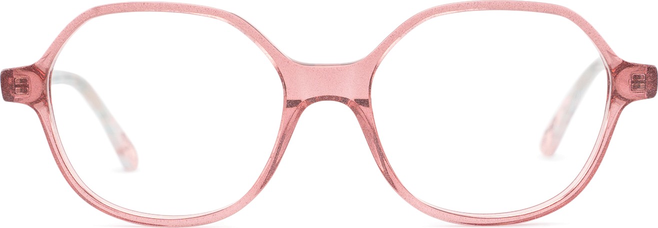 A cor rosa da armação combina perfeitamente com um tom de pele claro e um cabelo castanho ou loiro claro.