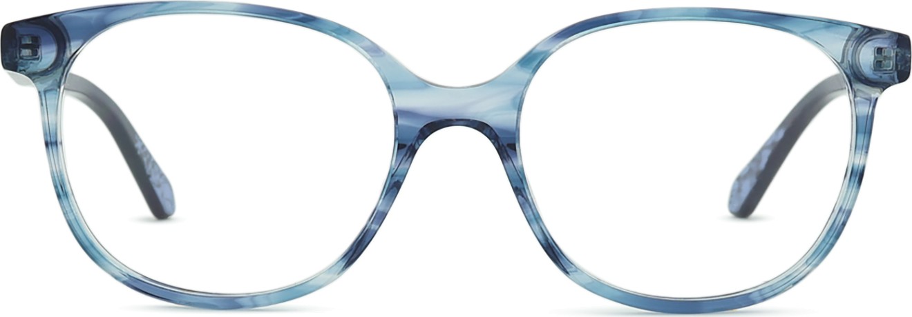 A cor azul da armação combina perfeitamente com um tom de pele claro e um cabelo castanho claro, preto ou loiro claro.