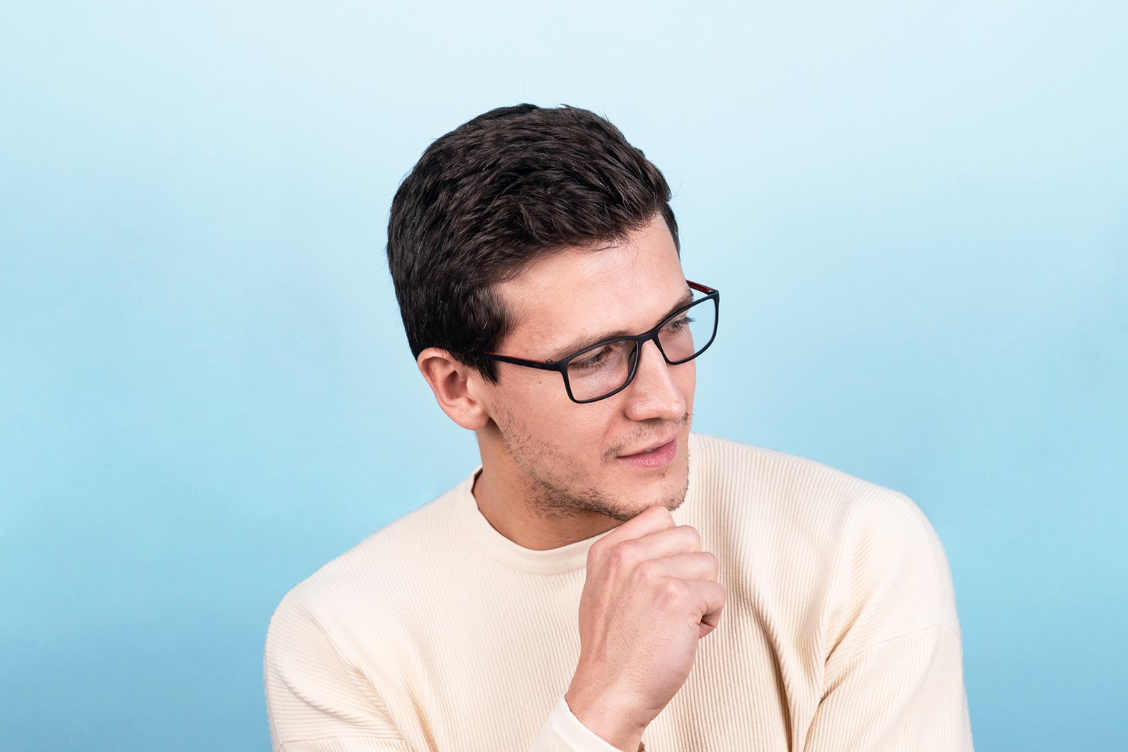 A cor preta da armação combina perfeitamente com um tom de pele claro e um cabelo loiro claro, castanho claro ou preto.