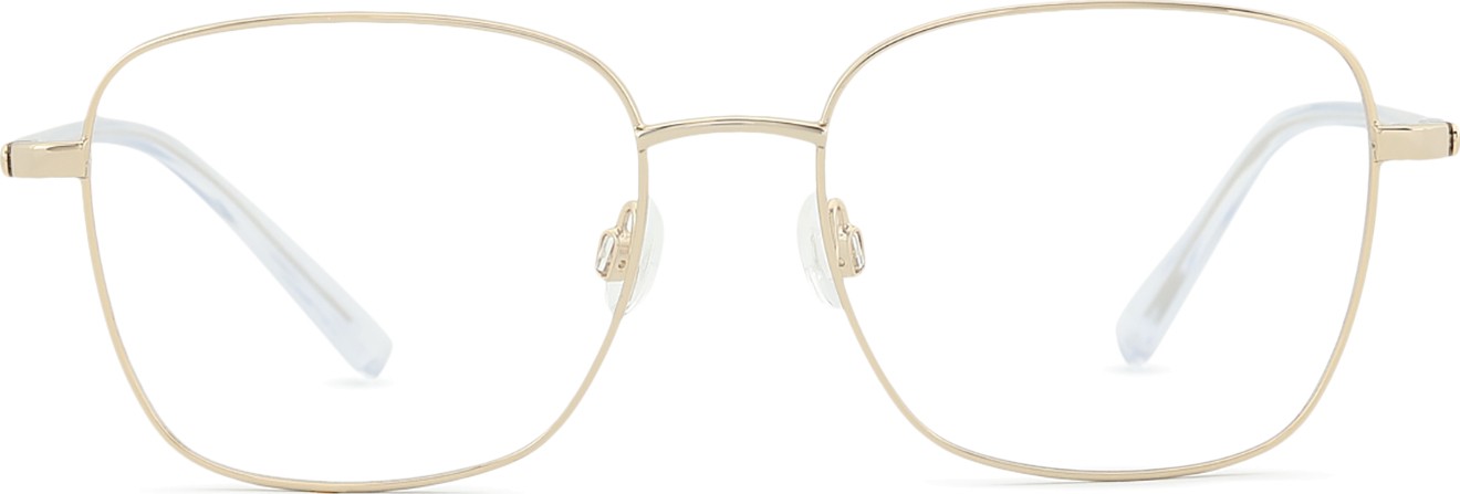 A cor dourada da armação combina perfeitamente com um tom de pele escuro e um cabelo castanho escuro.