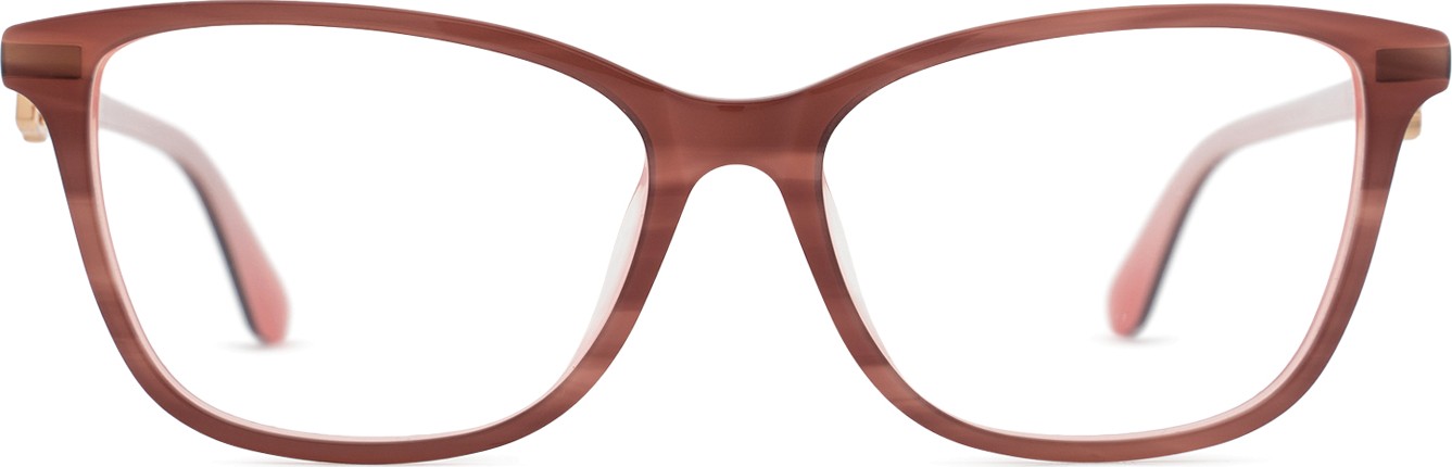 A cor rosa da armação combina perfeitamente com um tom de pele claro e um cabelo castanho ou loiro claro.