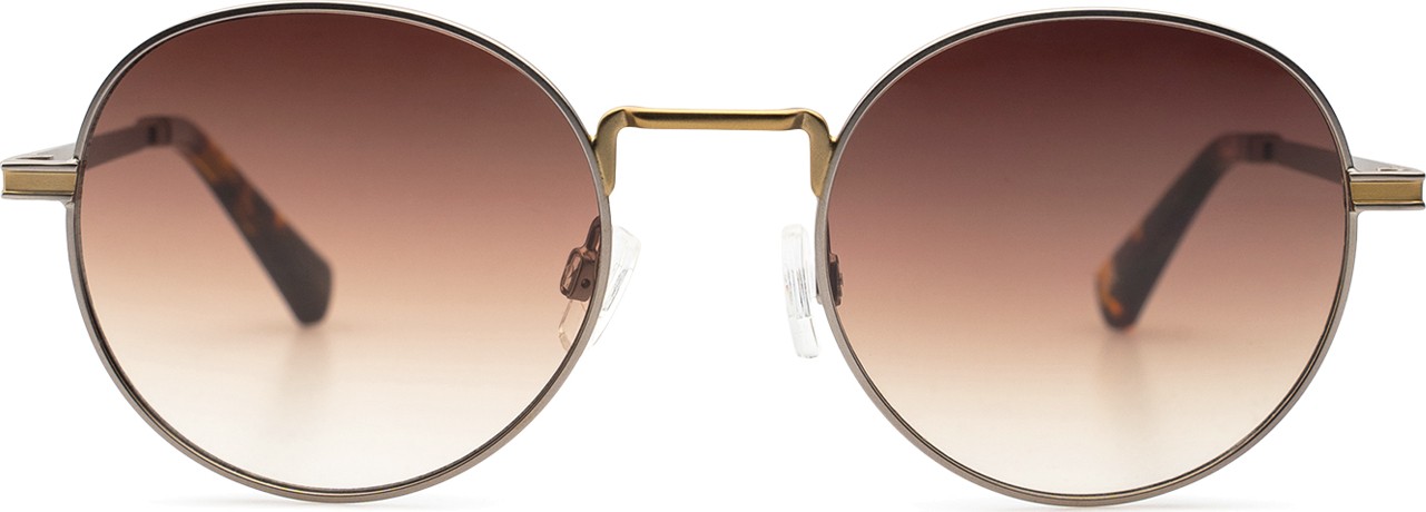 - A cor dourada da armação combina perfeitamente com um tom de pele quente e um cabelo castanho escuro.
