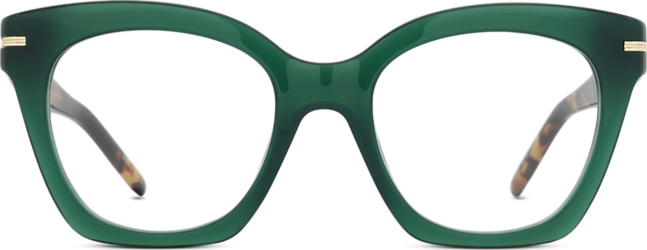 - A cor verde da armação combina perfeitamente com um tom de pele claro e um cabelo castanho escuro, preto ou ruivo.