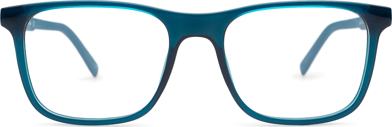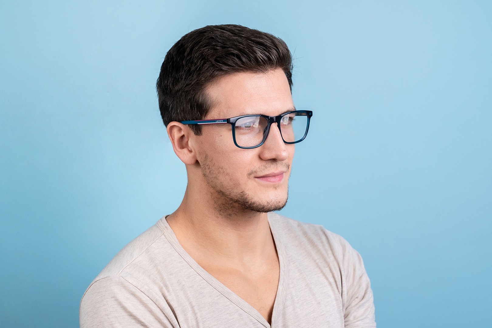 - A cor azul da armação combina perfeitamente com um tom de pele claro e um cabelo castanho claro, preto ou loiro claro.