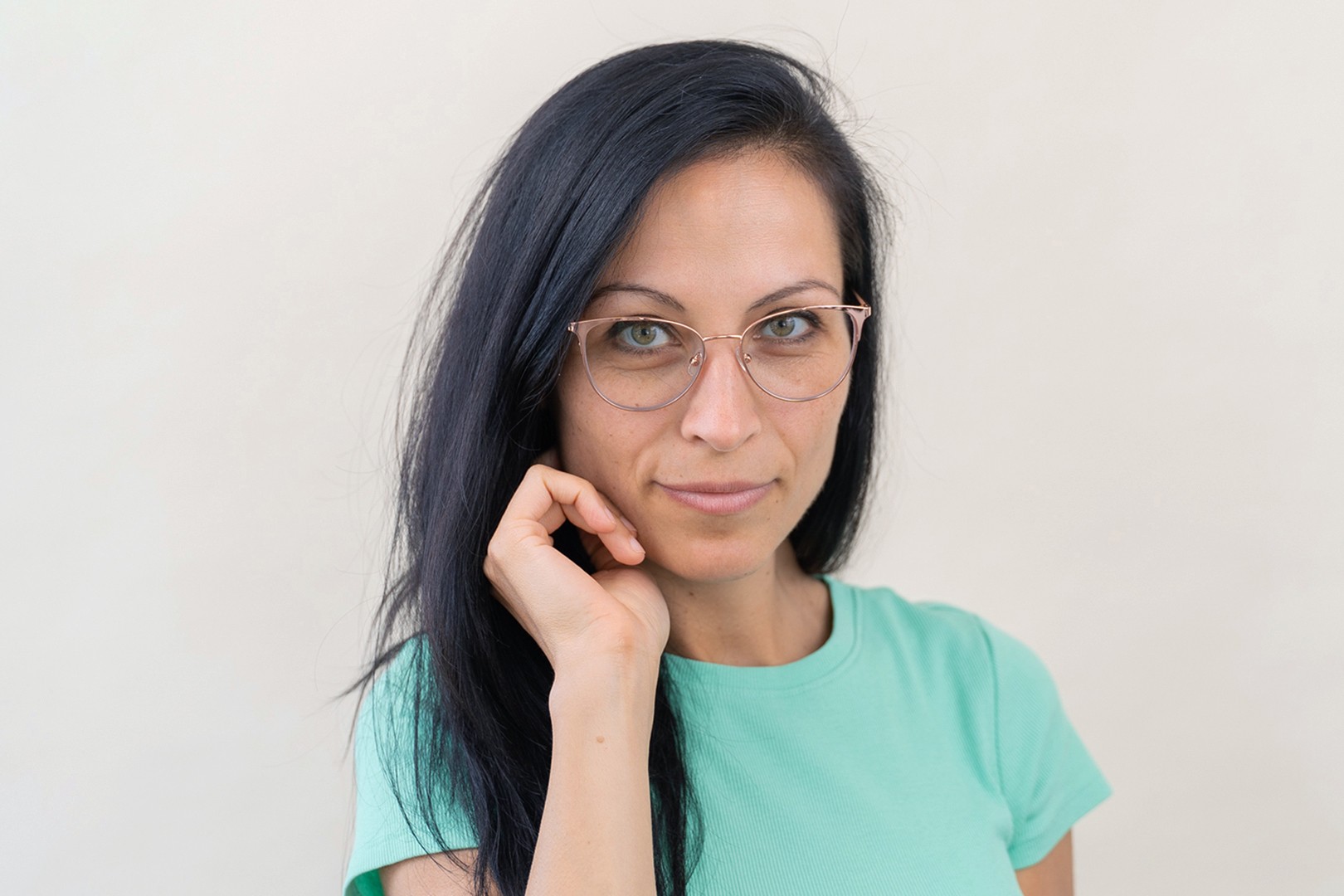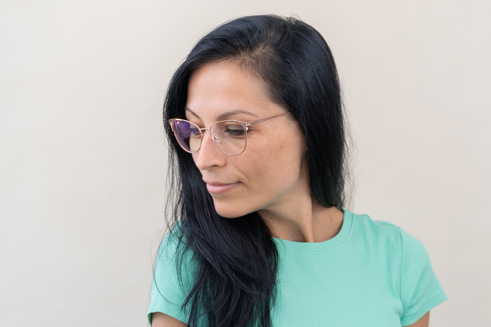- A cor rosa da armação combina perfeitamente com um tom de pele claro e um cabelo castanho ou loiro claro.