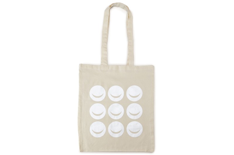 Saco de algodão de asa comprida com logo da Lentiamo. O saco pode ser lavado e usado repetidamente e é ecológico, em comparação com os sacos de plástico ou papel. O comprimento da asa é adequado para levar na mão ou sobre o ombro.