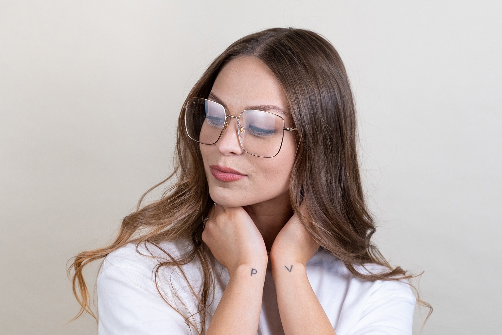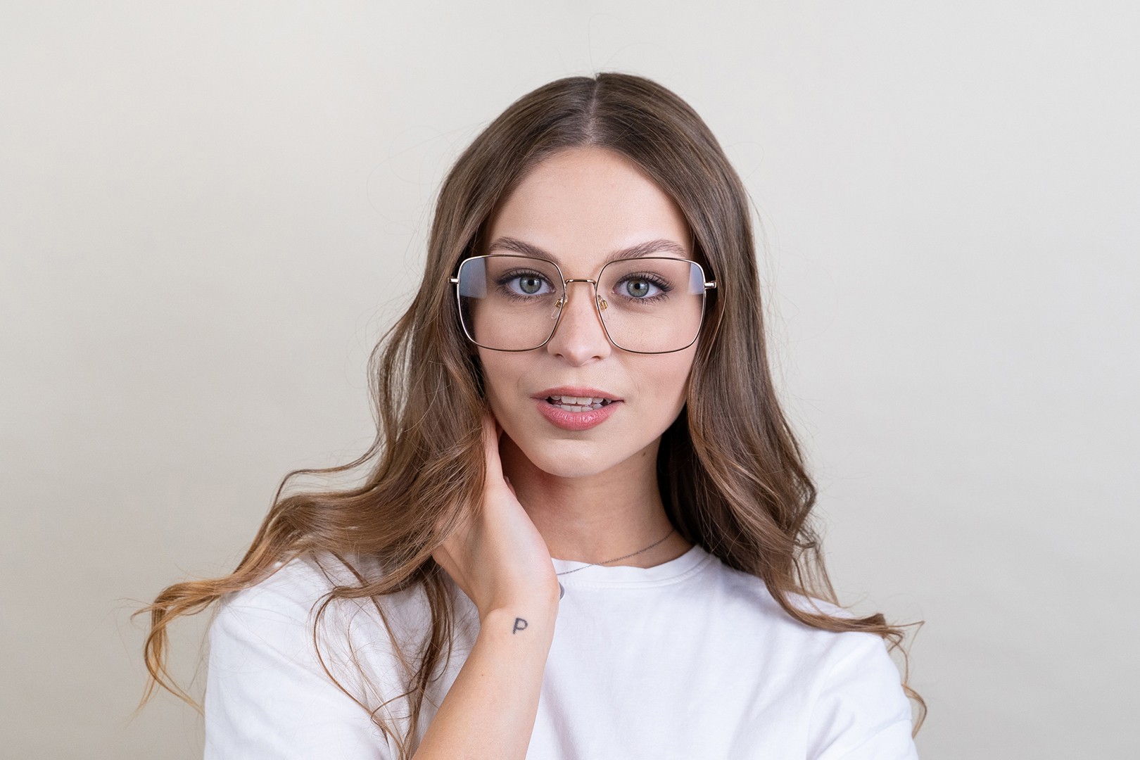 A cor dourada da armação combina perfeitamente com um tom de pele escuro e um cabelo castanho escuro.