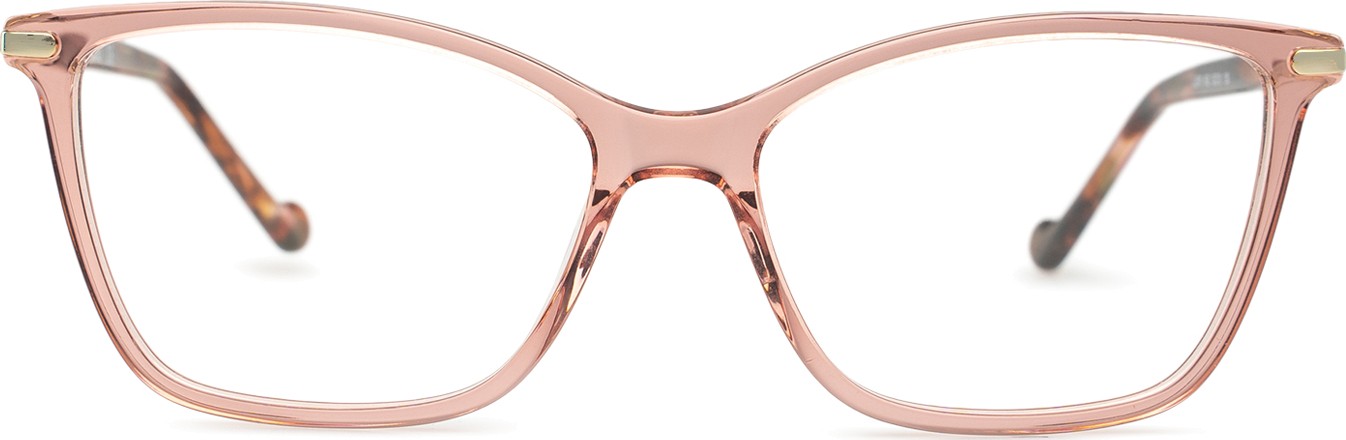 - A cor rosa da armação combina perfeitamente com um tom de pele claro e um cabelo castanho ou loiro claro.