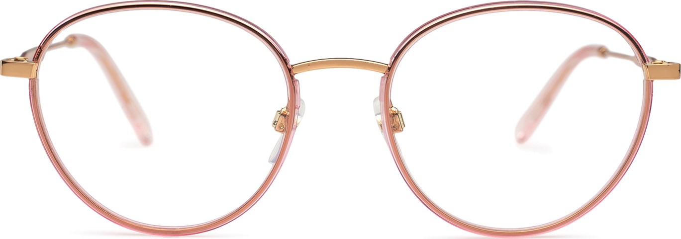 - A cor rosa da armação combina perfeitamente com um tom de pele claro e um cabelo castanho ou loiro claro.