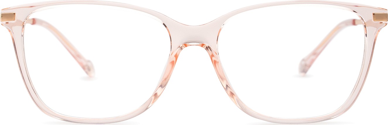 - A cor rosa da armação combina perfeitamente com um tom de pele claro e um cabelo castanho ou loiro claro.