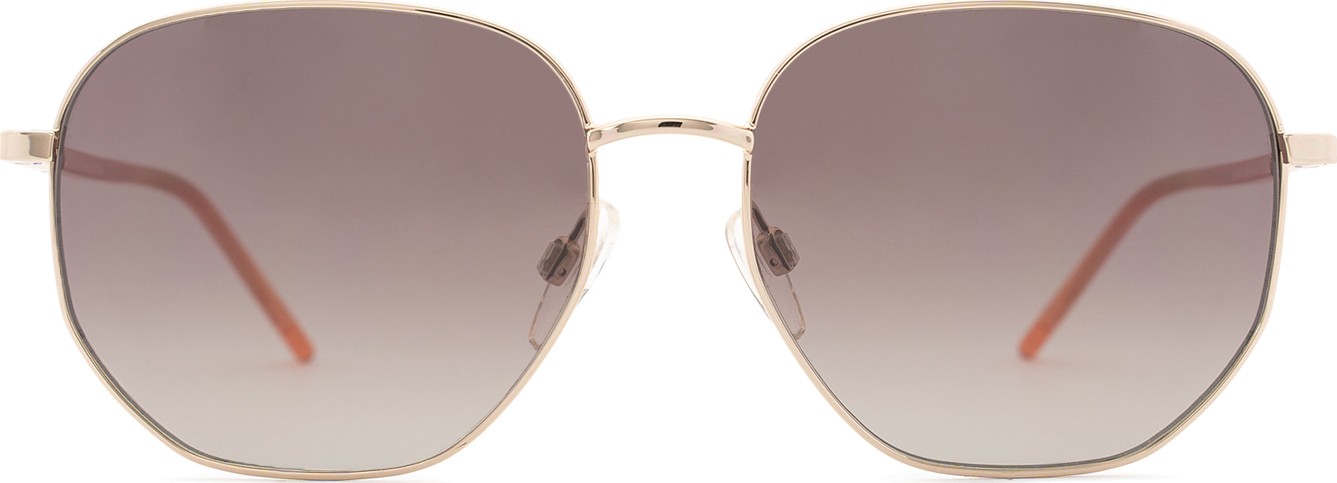 - A cor dourada da armação combina perfeitamente com um tom de pele quente e um cabelo castanho escuro.