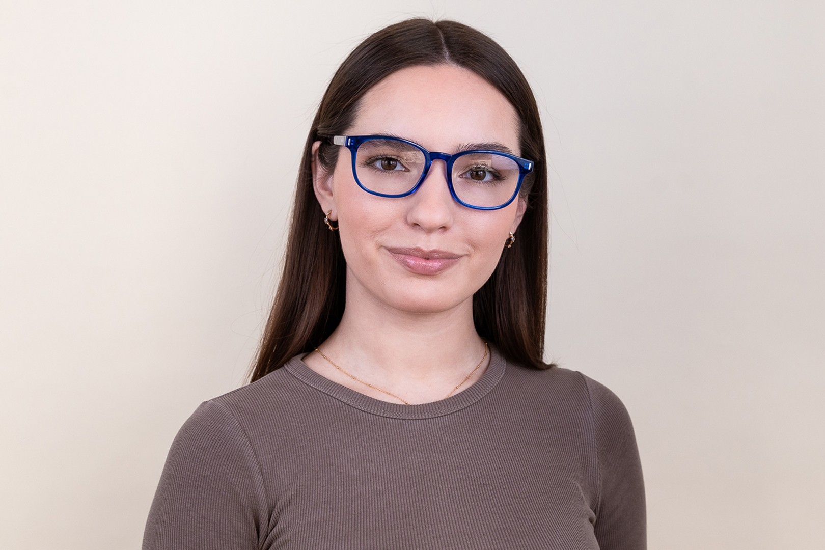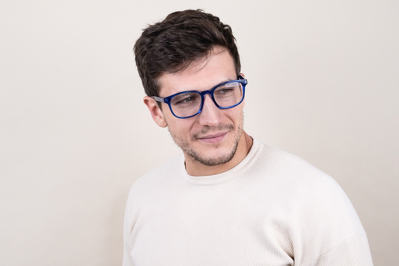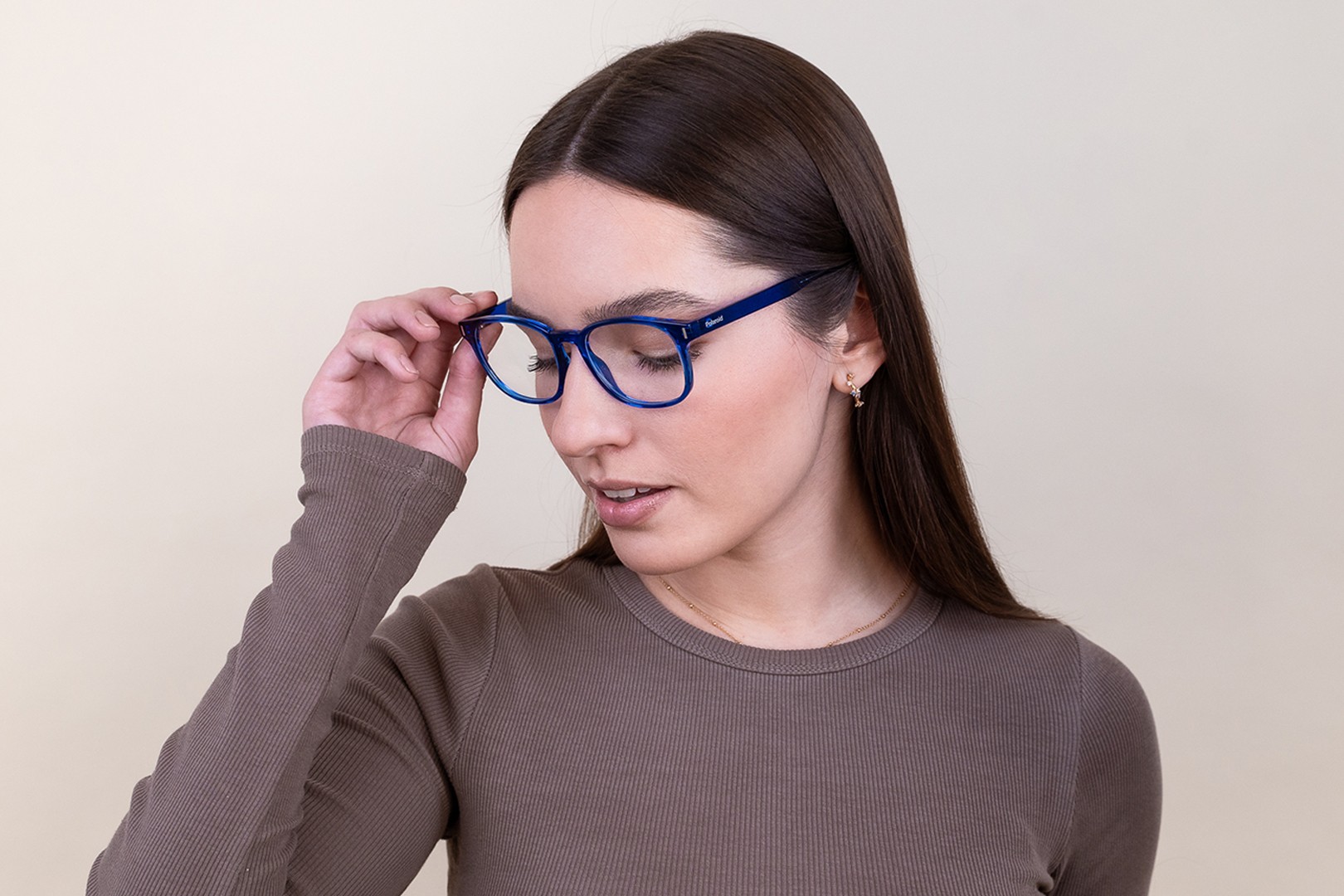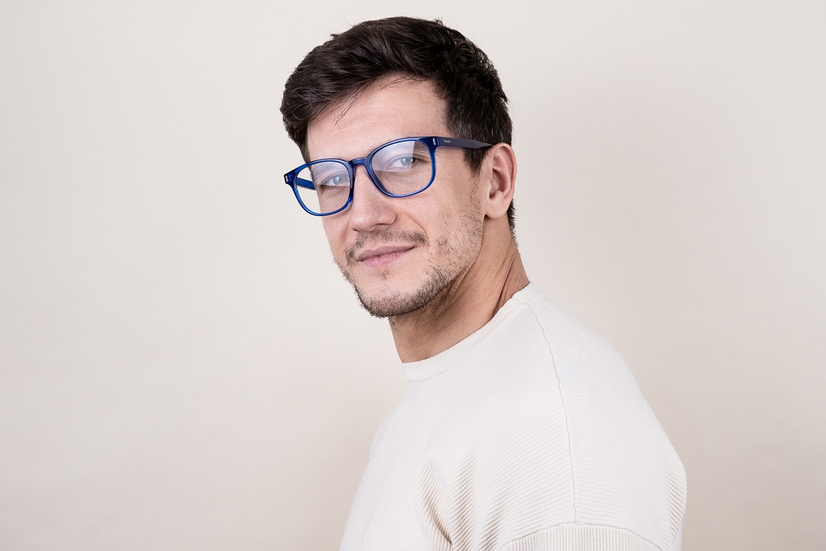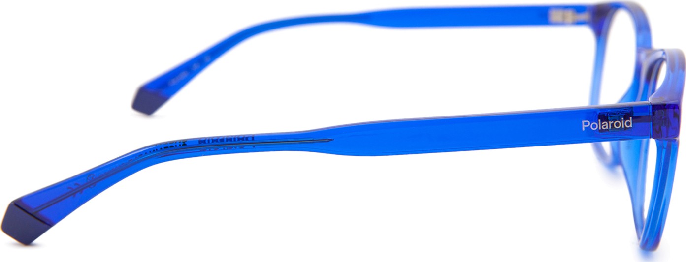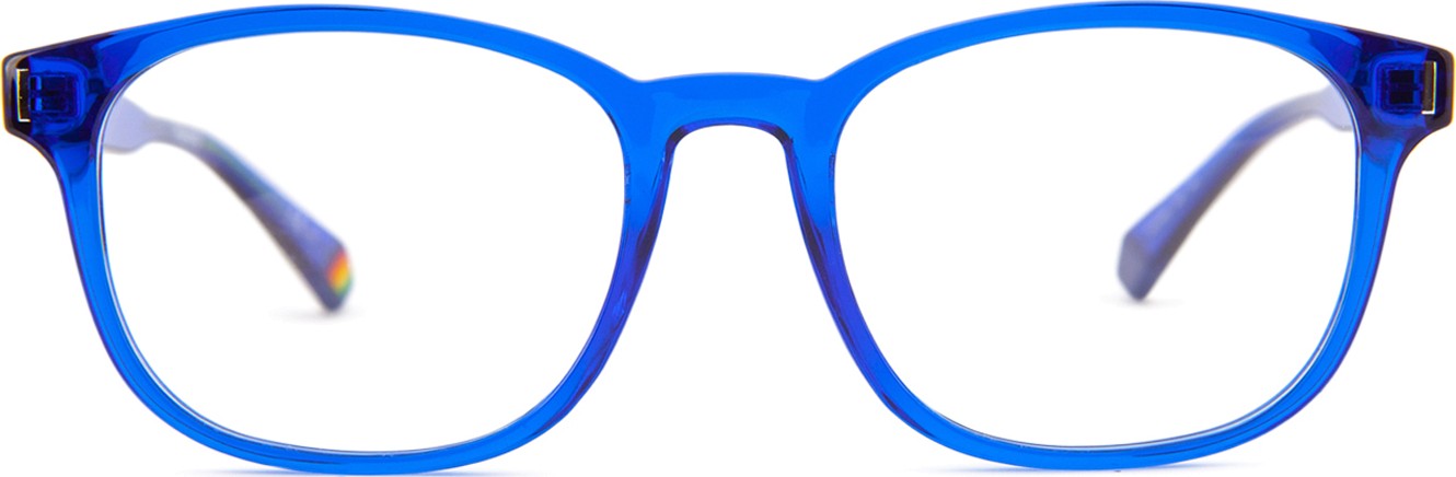 - A cor azul da armação combina perfeitamente com um tom de pele claro e um cabelo castanho claro, preto ou loiro claro.