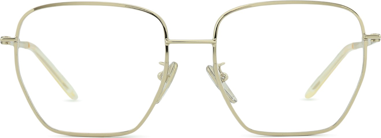 A cor dourada da armação combina perfeitamente com um tom de pele escuro e um cabelo castanho escuro.