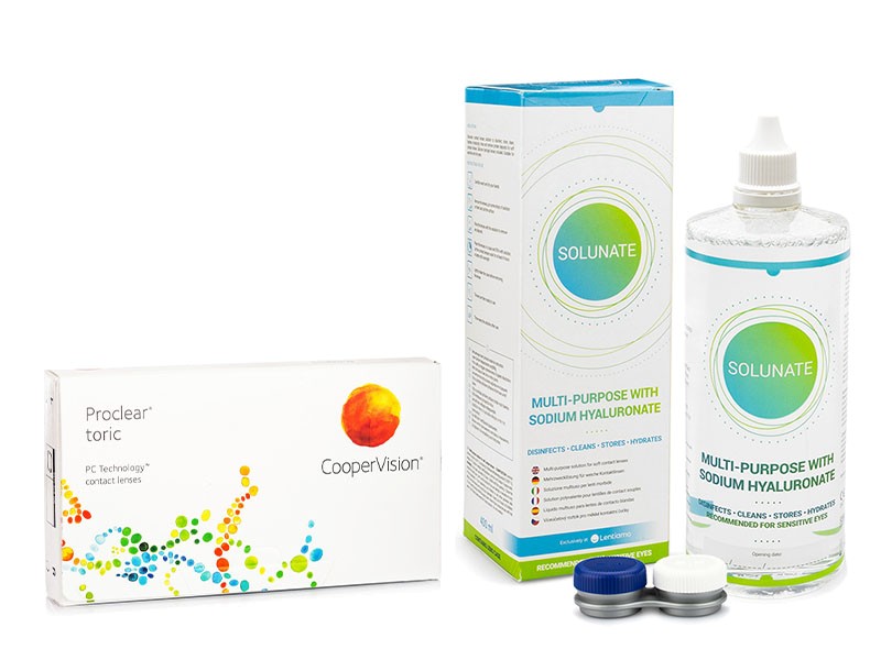 Oferecemos um pack de poupança com as lentes mensais Proclear Toric (6 lentes) e o líquido Solunate Multi-Purpose 400 ml.