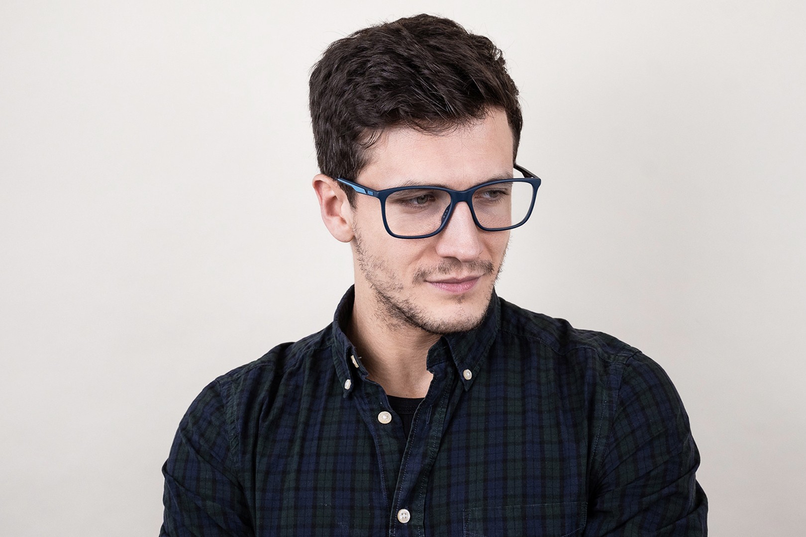 - A cor azul da armação combina perfeitamente com um tom de pele claro e um cabelo castanho claro, preto ou loiro claro.