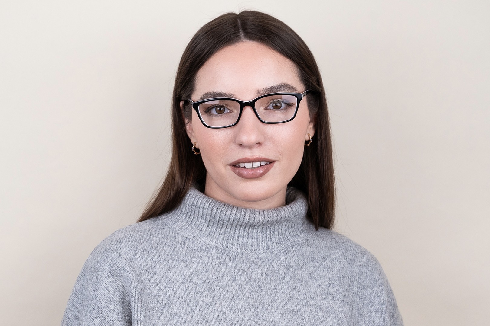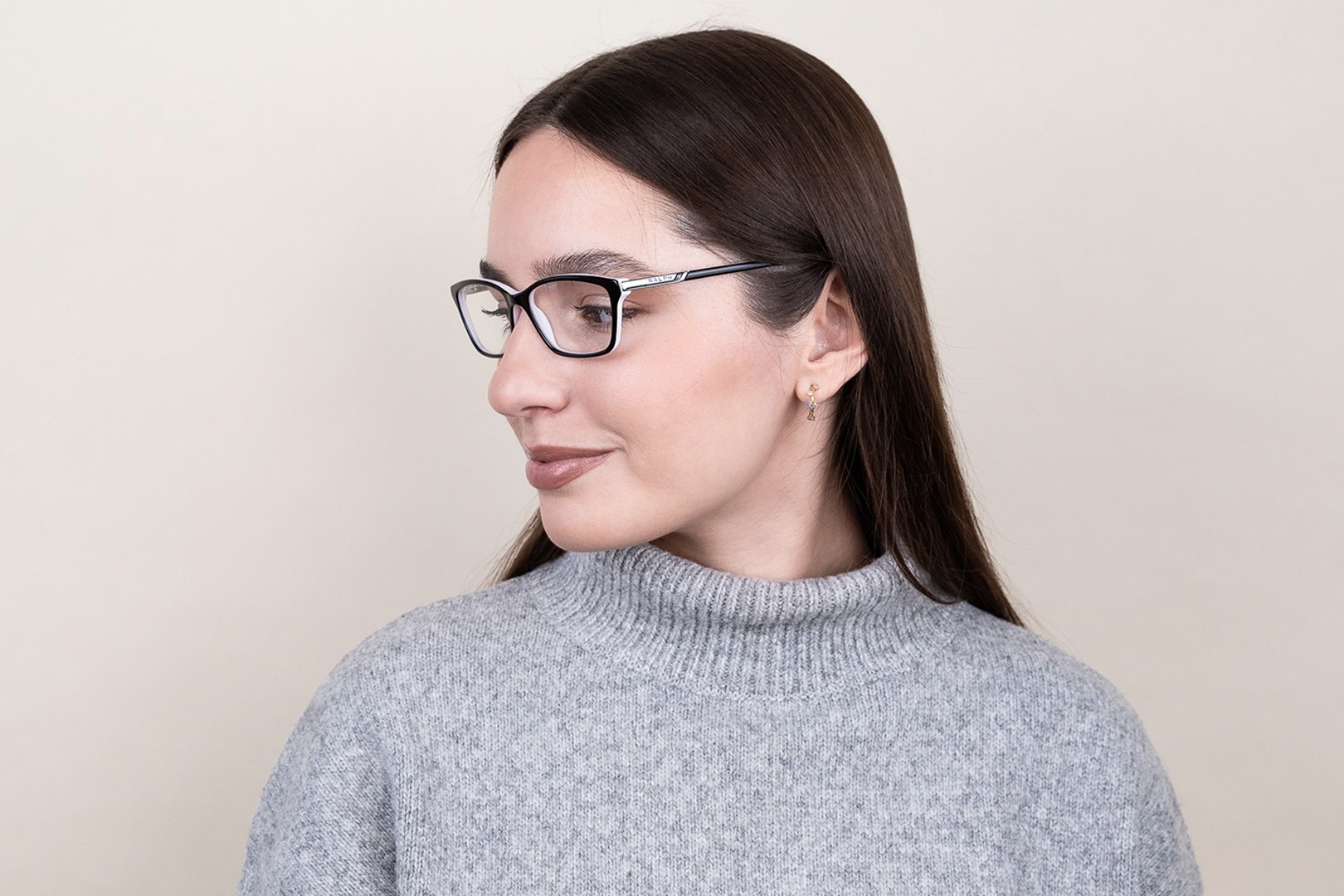 A cor preta da armação combina perfeitamente com um tom de pele claro e um cabelo loiro claro, castanho claro ou preto.