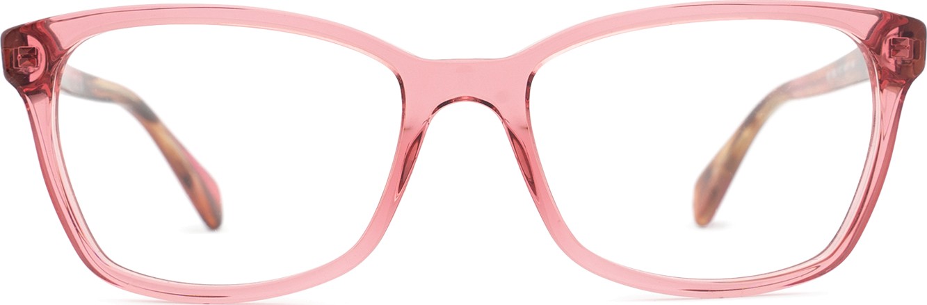 - A cor rosa da armação combina perfeitamente com um tom de pele claro e um cabelo castanho ou loiro claro.