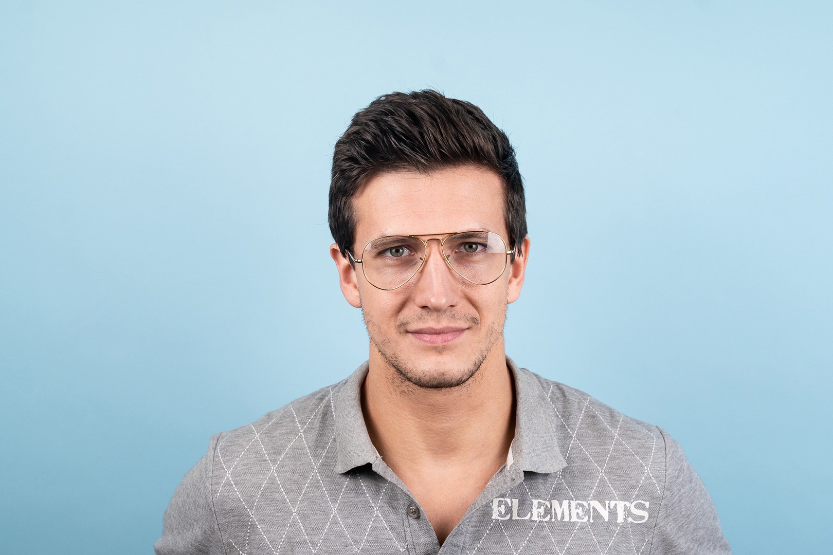 - A cor dourada da armação combina perfeitamente com um tom de pele escuro e um cabelo castanho escuro.