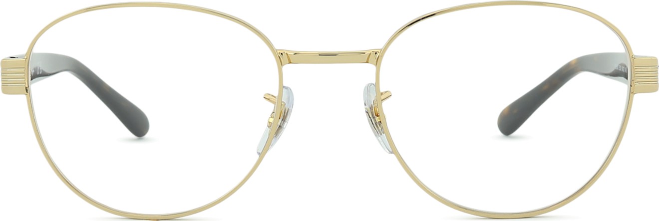 A cor dourada da armação combina perfeitamente com um tom de pele escuro e um cabelo castanho escuro.