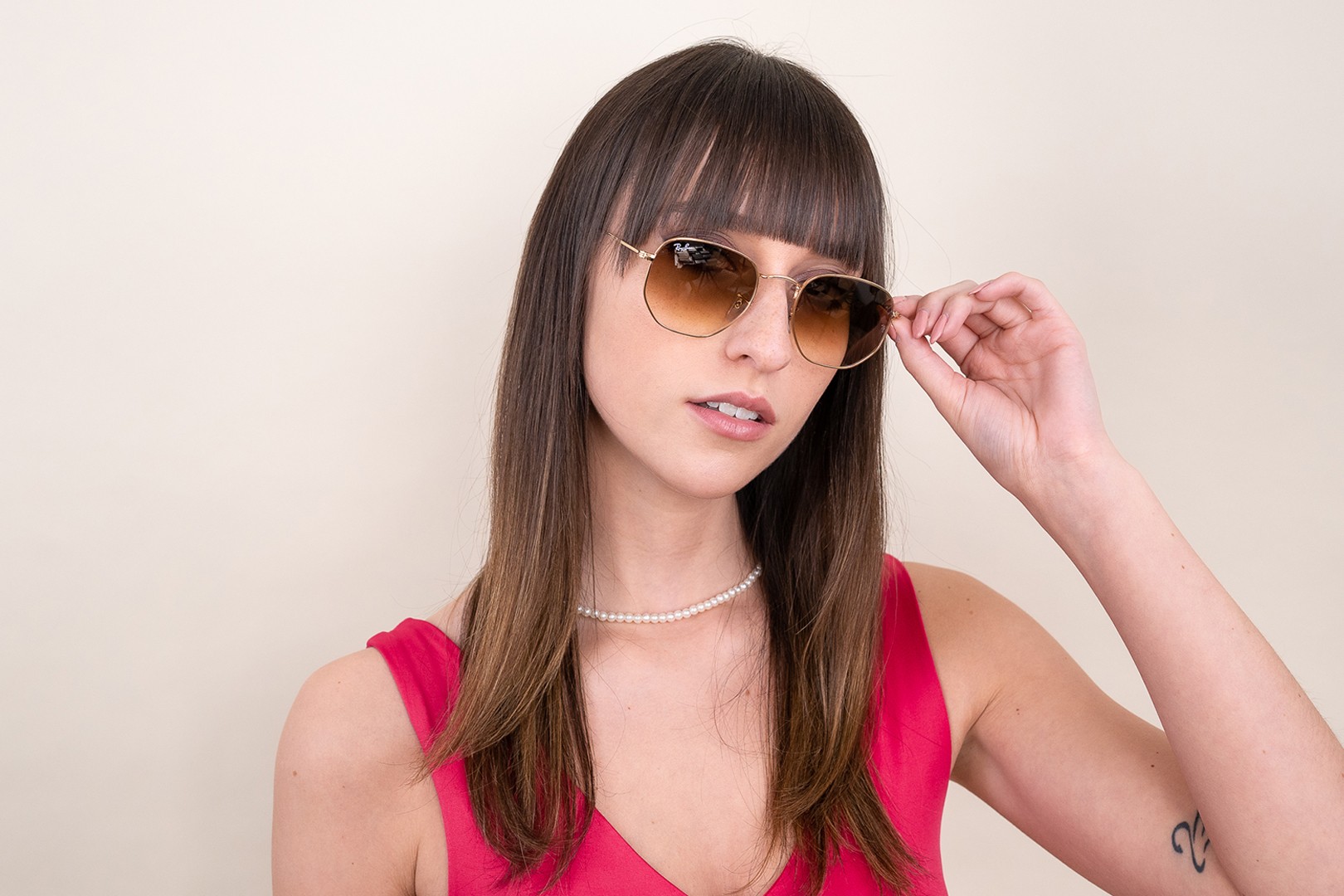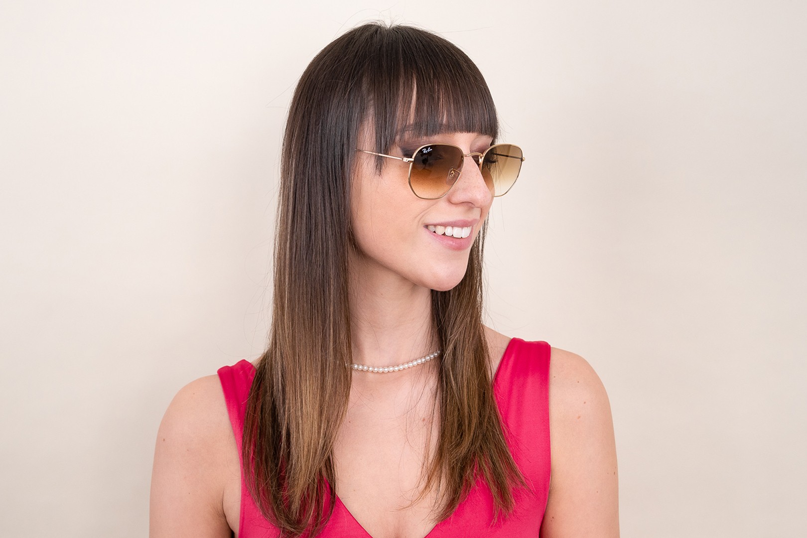A cor dourada da armação combina perfeitamente com um tom de pele quente e um cabelo castanho escuro.