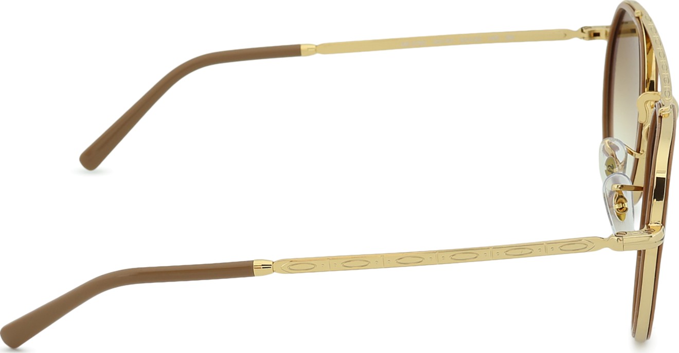 - A cor dourada da armação combina perfeitamente com um tom de pele quente e um cabelo castanho escuro.