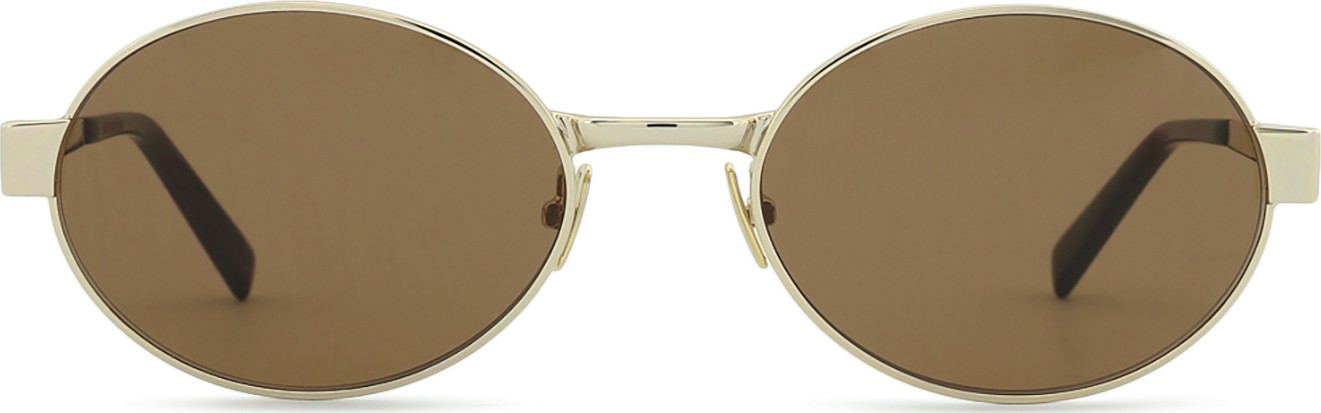 - A cor dourada da armação combina perfeitamente com um tom de pele quente e um cabelo castanho escuro.