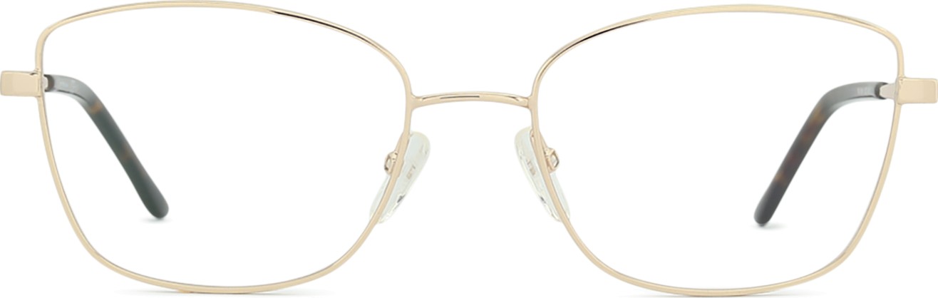 - A cor dourada da armação combina perfeitamente com um tom de pele escuro e um cabelo castanho escuro.