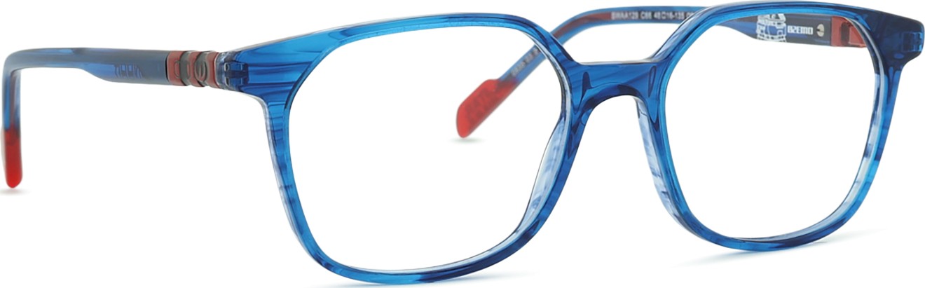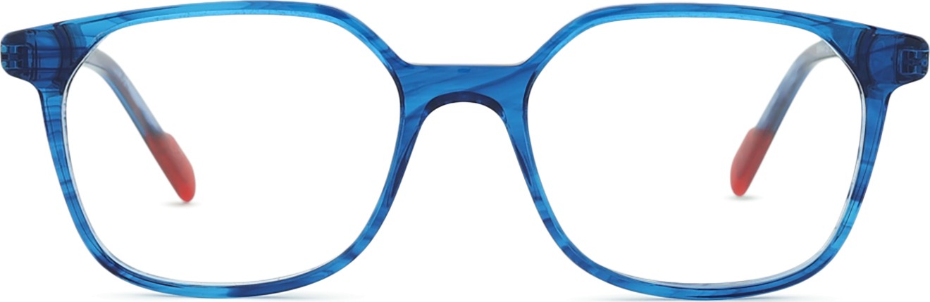 A cor azul da armação combina perfeitamente com um tom de pele claro e um cabelo castanho claro, preto ou loiro claro.