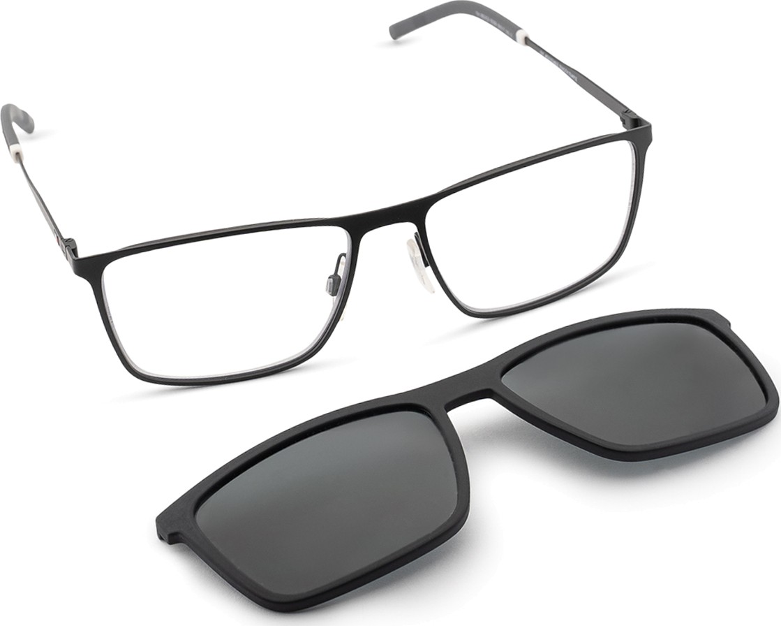 - Os óculos também incluem um clip solar adicional, que se fixa facilmente à armação dos óculos e os transforma em óculos de sol. O clip adapta-se perfeitamente à forma da armação e a sua instalação é muito rápida e simples. No entanto, se tiver dioptrias mais altas, é necessário escolher uma versão mais fina das lentes para que o clip não toque na superfície esférica frontal das lentes e se ajuste corretamente à armação.
