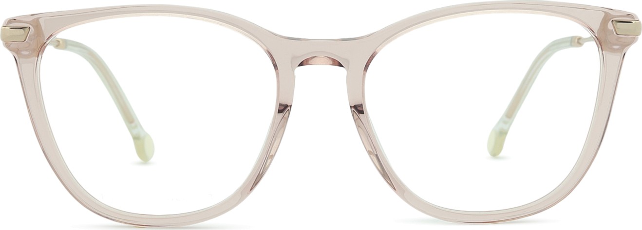 - A cor bege da armação combina perfeitamente com um tom de pele escuro e um cabelo castanho claro.