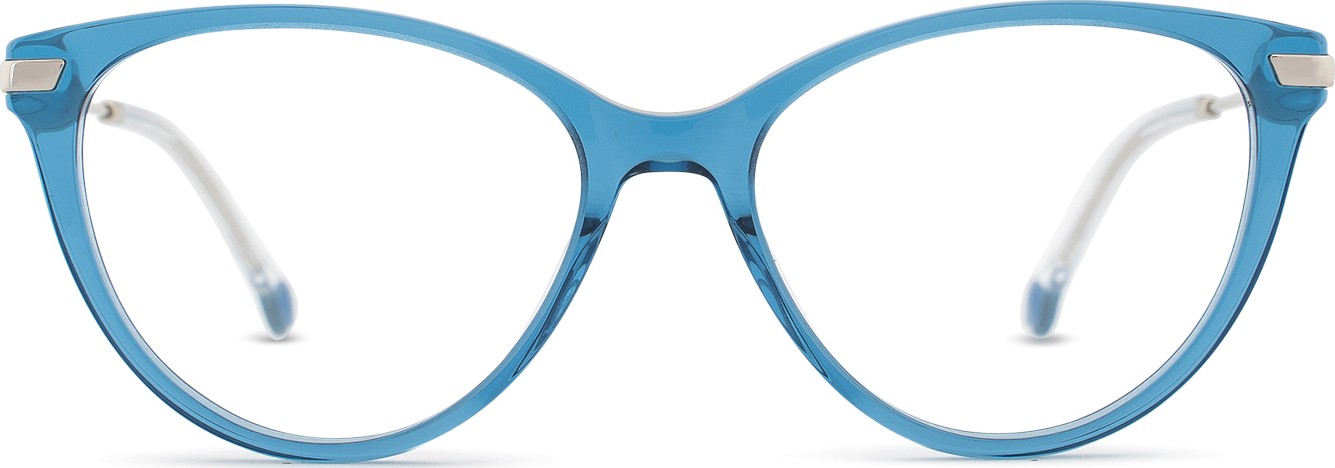 A cor azul da armação combina perfeitamente com um tom de pele claro e um cabelo castanho claro, preto ou loiro claro.