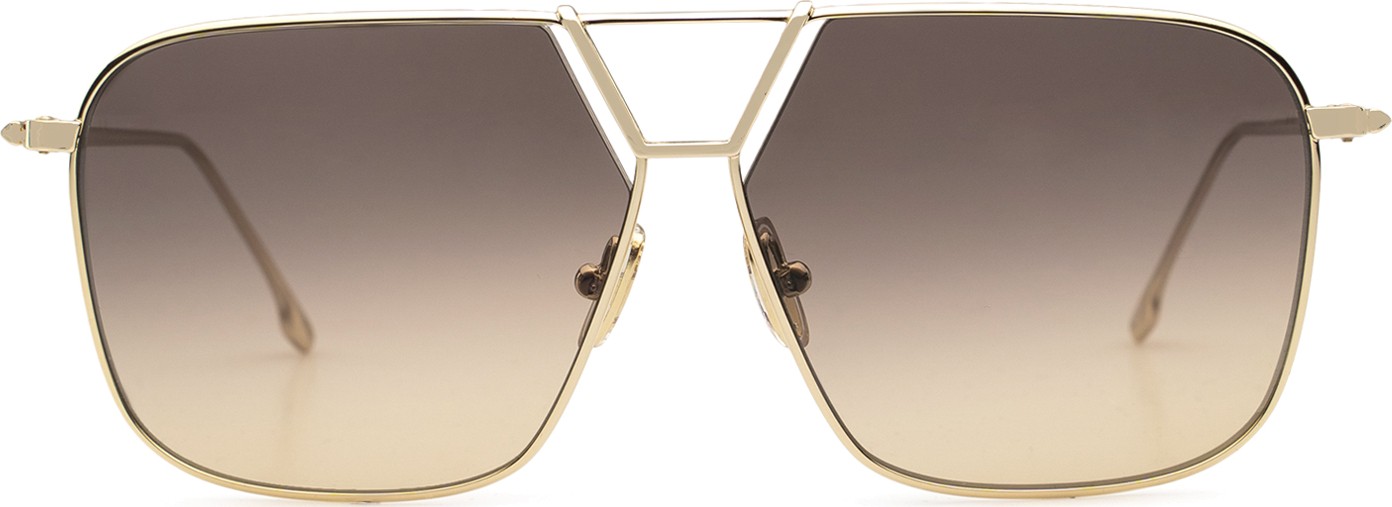 - A cor dourada da armação combina perfeitamente com um tom de pele quente e um cabelo castanho escuro.