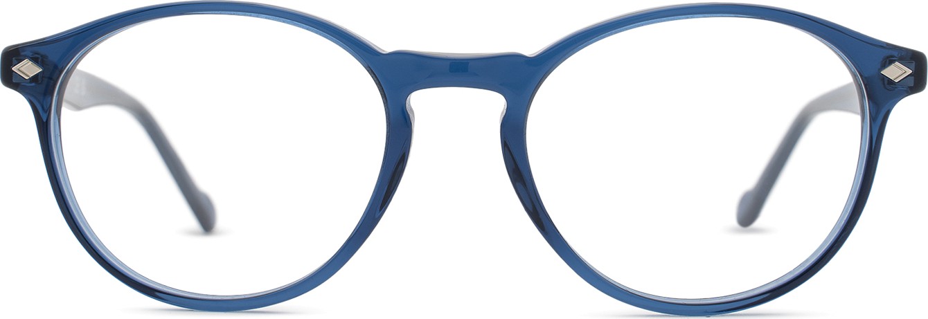 - A cor azul da armação combina perfeitamente com um tom de pele claro e um cabelo castanho claro, preto ou loiro claro.