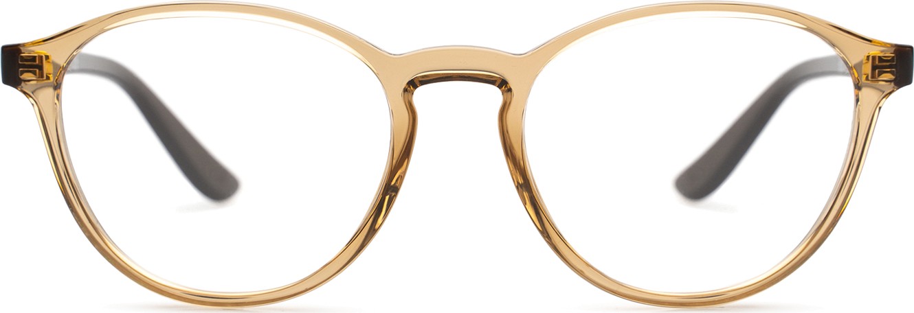 - A cor bege da armação combina perfeitamente com um tom de pele escuro e um cabelo castanho claro.